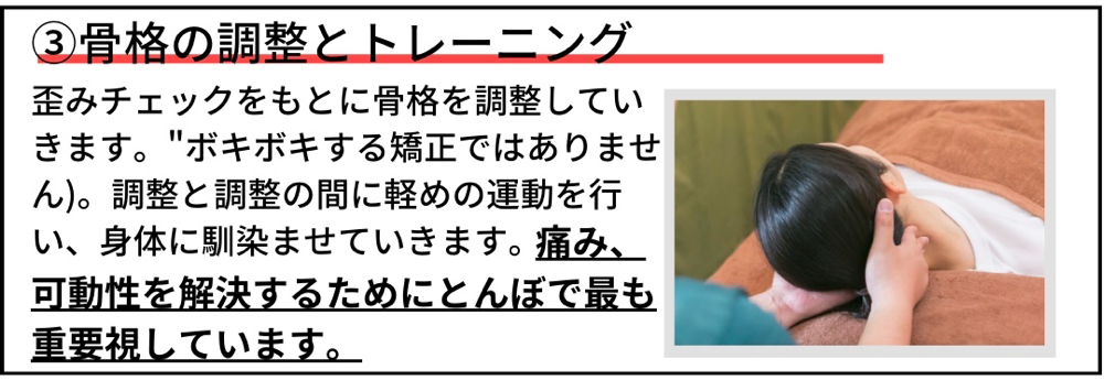 無料体験では、肩甲骨はがし・骨盤調整・背骨調整を中心に体験していただきます。