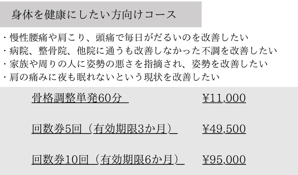 骨格調整は、痛みや不調に困らない身体を作っていくコースとなります。そのため、1度や2度の施術ではなく、最低でも10回前後の施術をお受けいただき、成果につなげていくというメニューになります。
