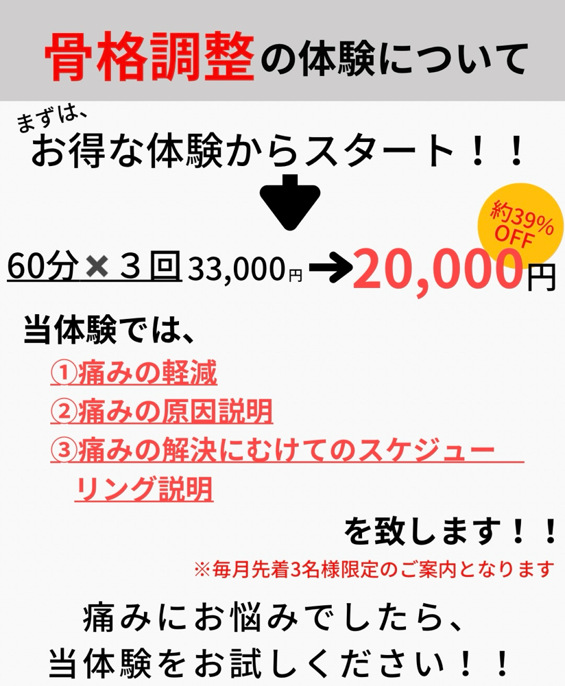 ※ご予約時に、「ホームページの骨格調整体験を受けたい」「初めてです」とお伝えください。